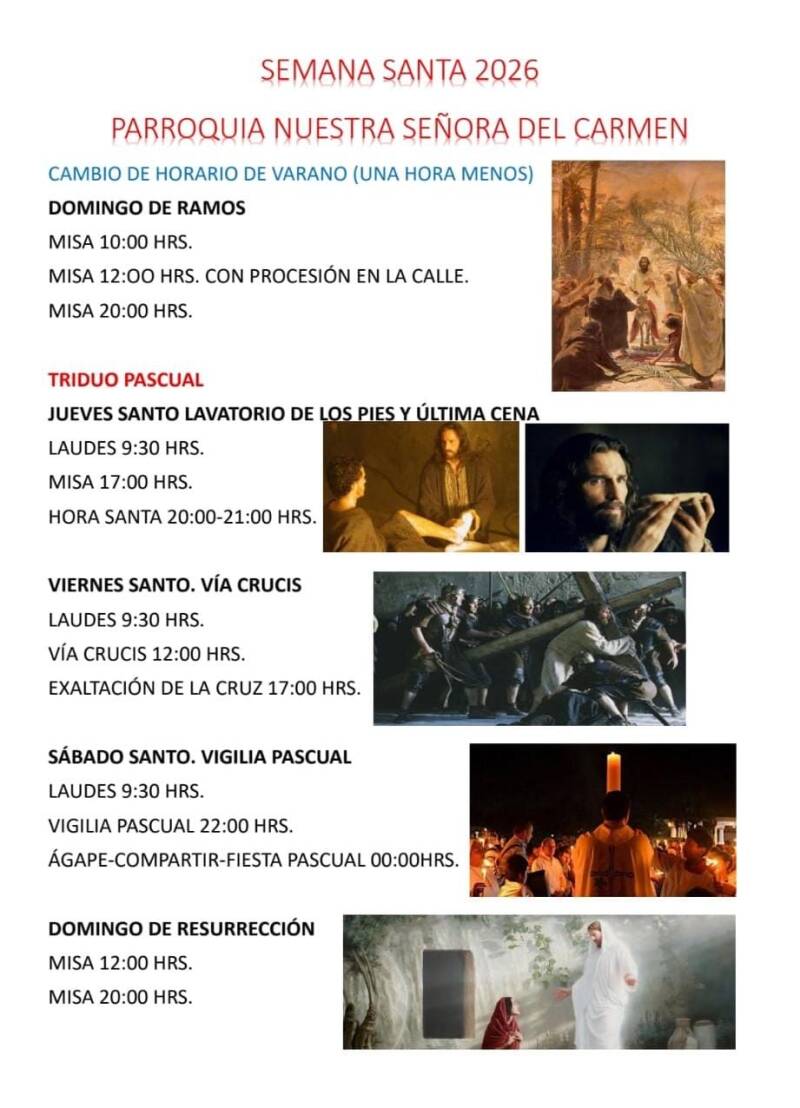 A partir de hoy día 1 de Octubre las misas se celebran a las 19:30H y el rosario a las 19:00H y el domingo día 5 de octubre las misas se celebrarán a las 10:00H-12:00H a esta hora será la misa del ENVÍO DE LAS PASTORALES y por la tarde será 19:30 H