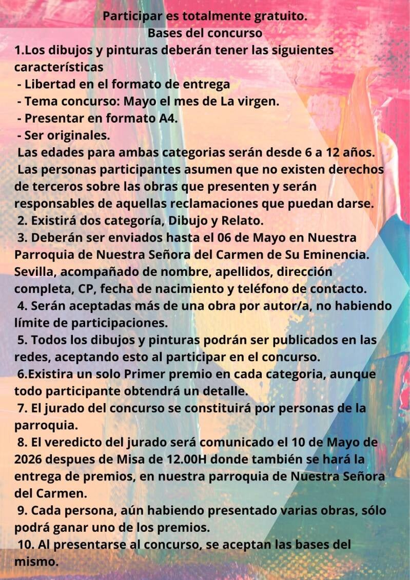 8. El veredicto del jurado será comunicado el 10 de Mayo de 2026 despues de Misa de 12.00 H donde también se hará la entrega de premios, en nuestra parroquia de Nuestra Señora del Carmen.